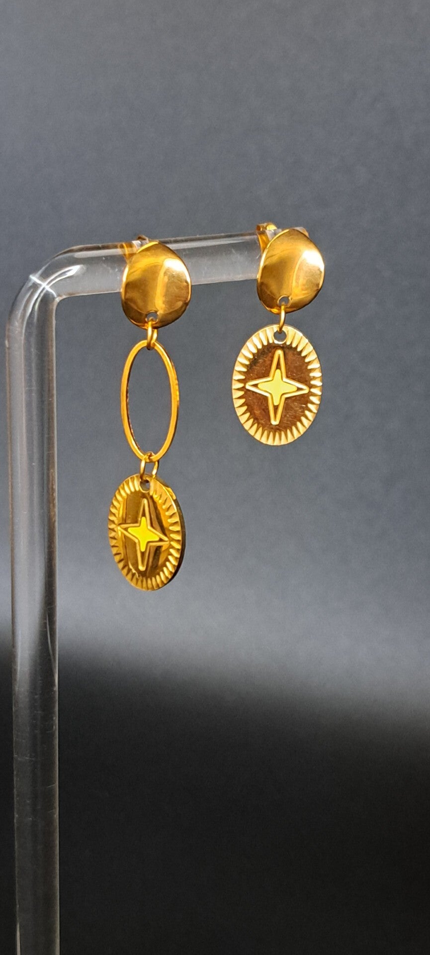 Boucle d'oreille asymétrique dorée avec sa rose des vents jaune