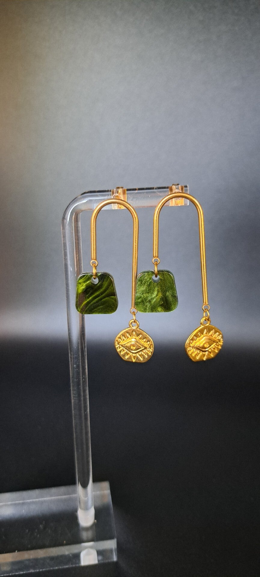 Ces boucles d'oreilles dorées arrondi et son oeil protecteur avec résine trapèze vert olive vous sublimera