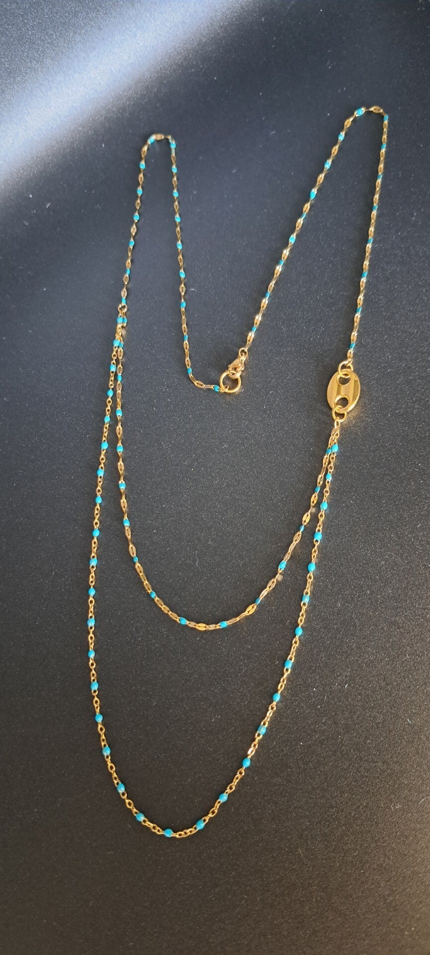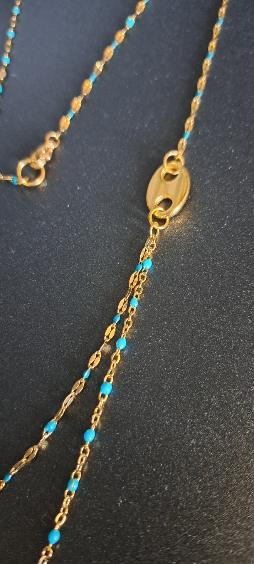 collier long doré en acier inoxydable avec 2 chaines perlée bleu