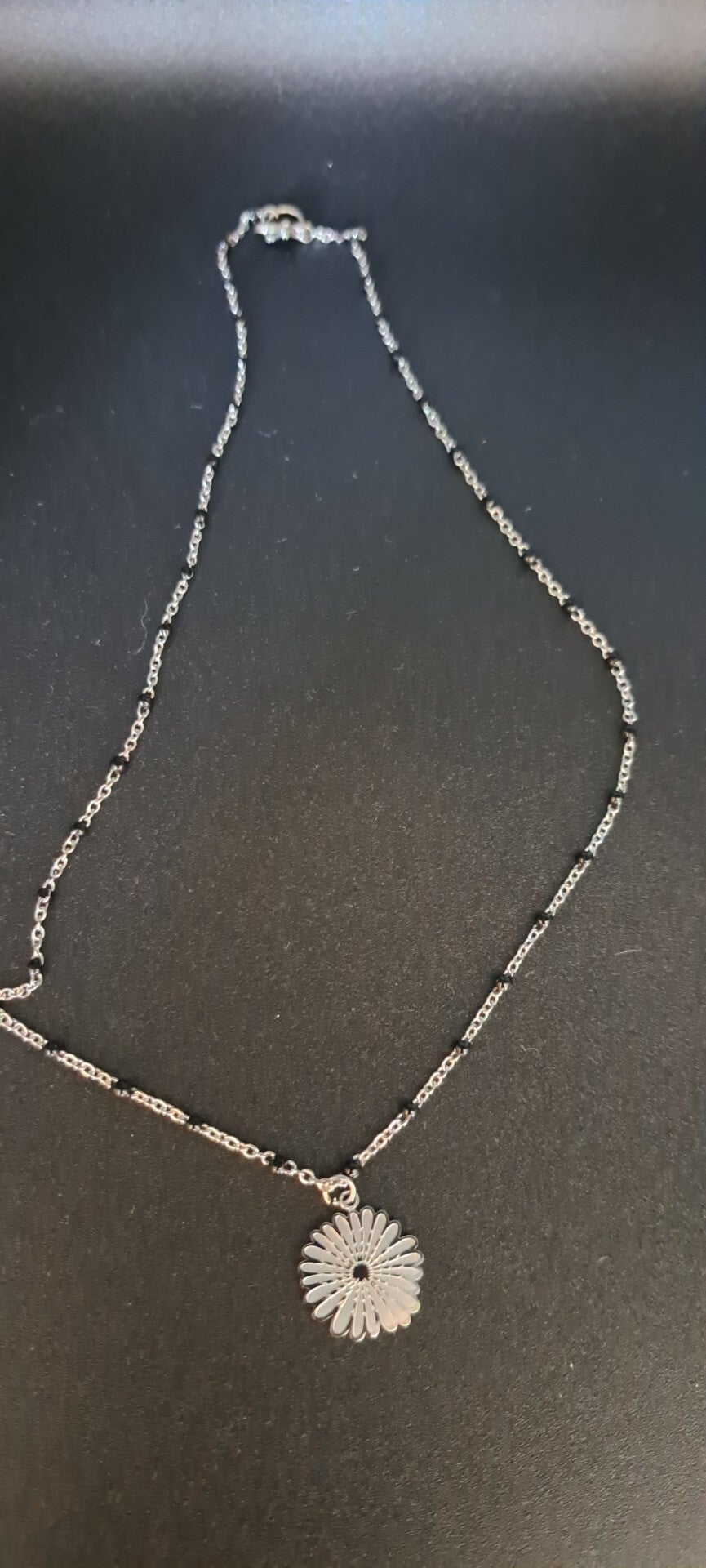 collier argenté en acier inoxydable, chaine perlée noir avec sa breloque margueritte (41 cm)