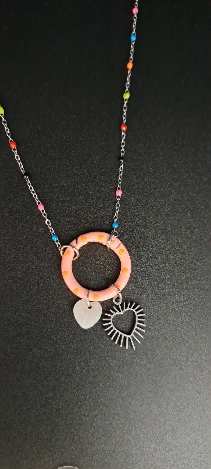 collier argenté en acier inoxydable avec sa chaine multicolore et son fermoir mousqueton rose. Breloque coeur en nacre et en acier argenté (44 cm)