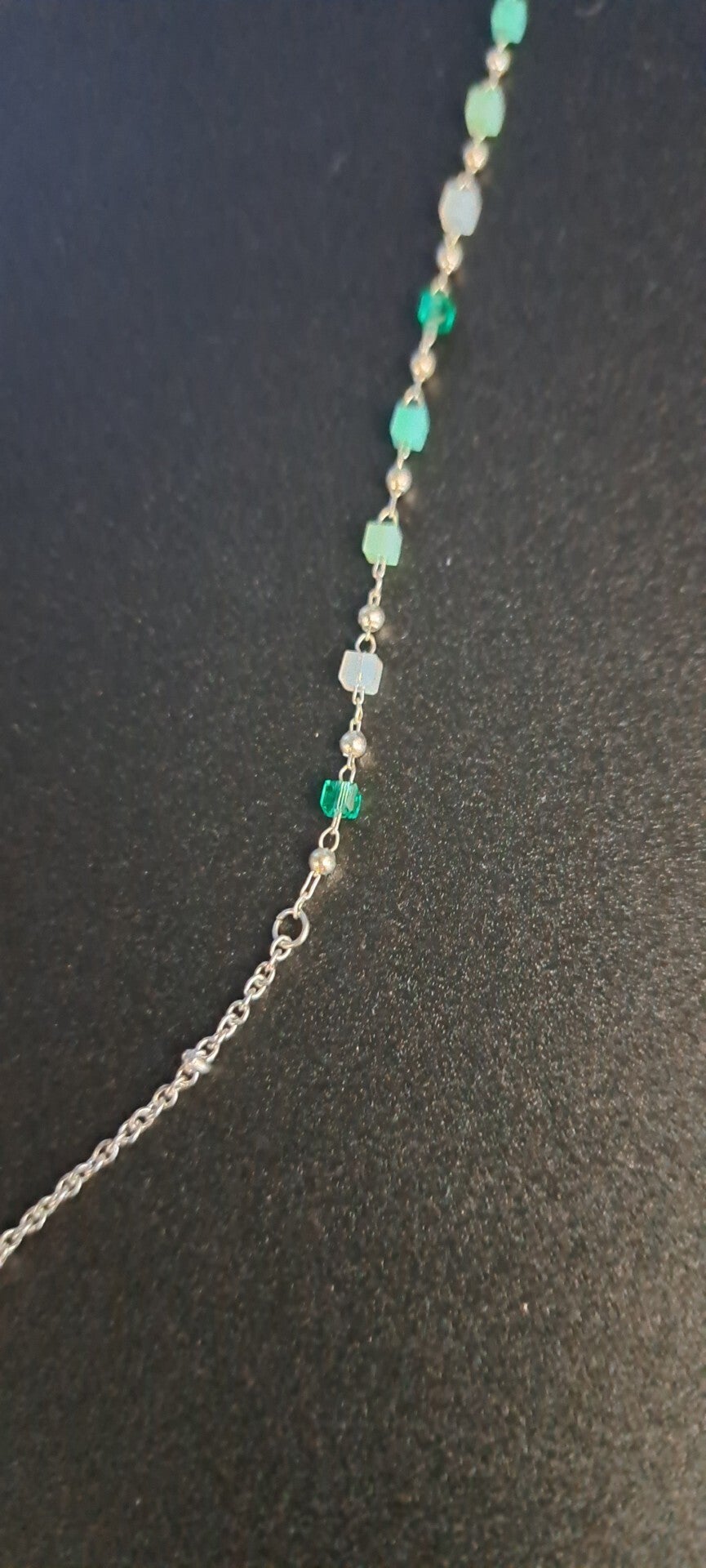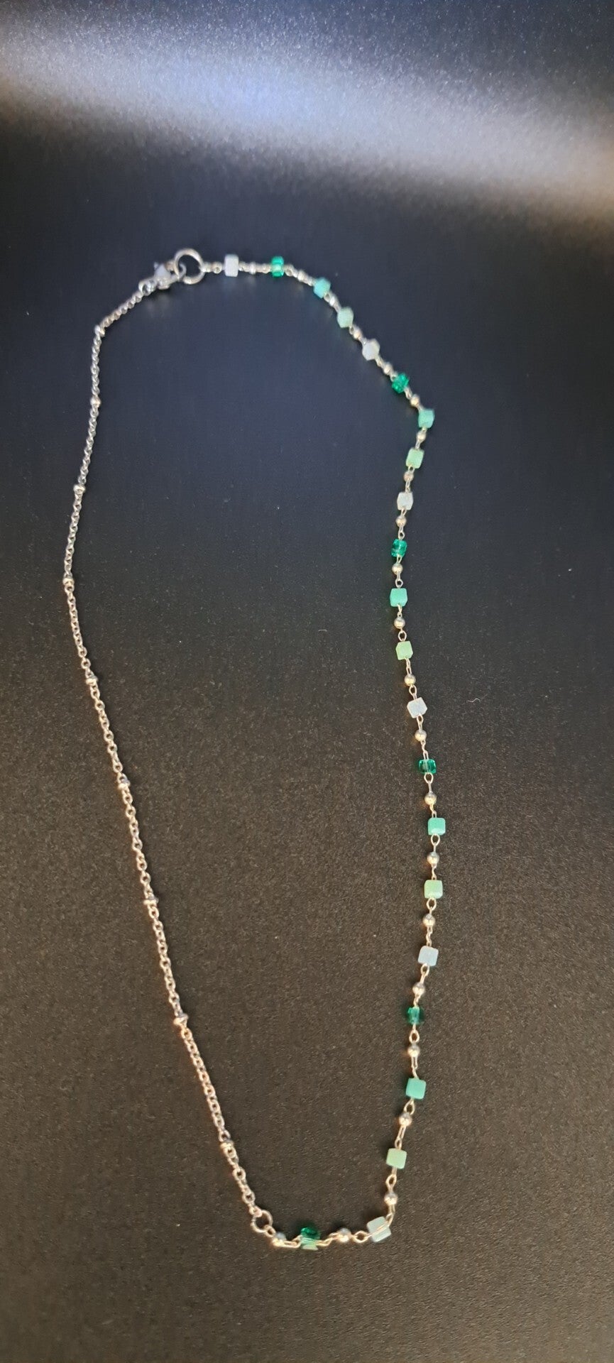 collier argenté en acier inoxydable avec sa chaine perlée, sa chaine cube dans les tons vert (41.5 cm)
