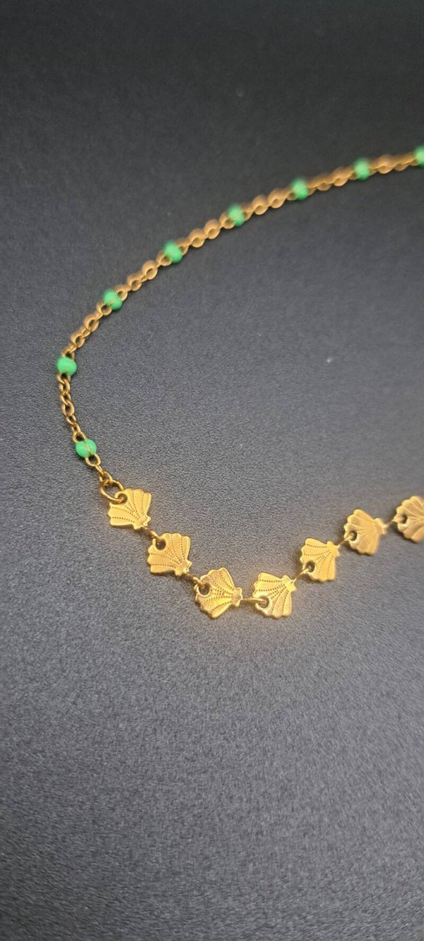 Bracelet de cheville doré composé d'une chaine perlée verte et d'une chaine coquillage (24 cm)