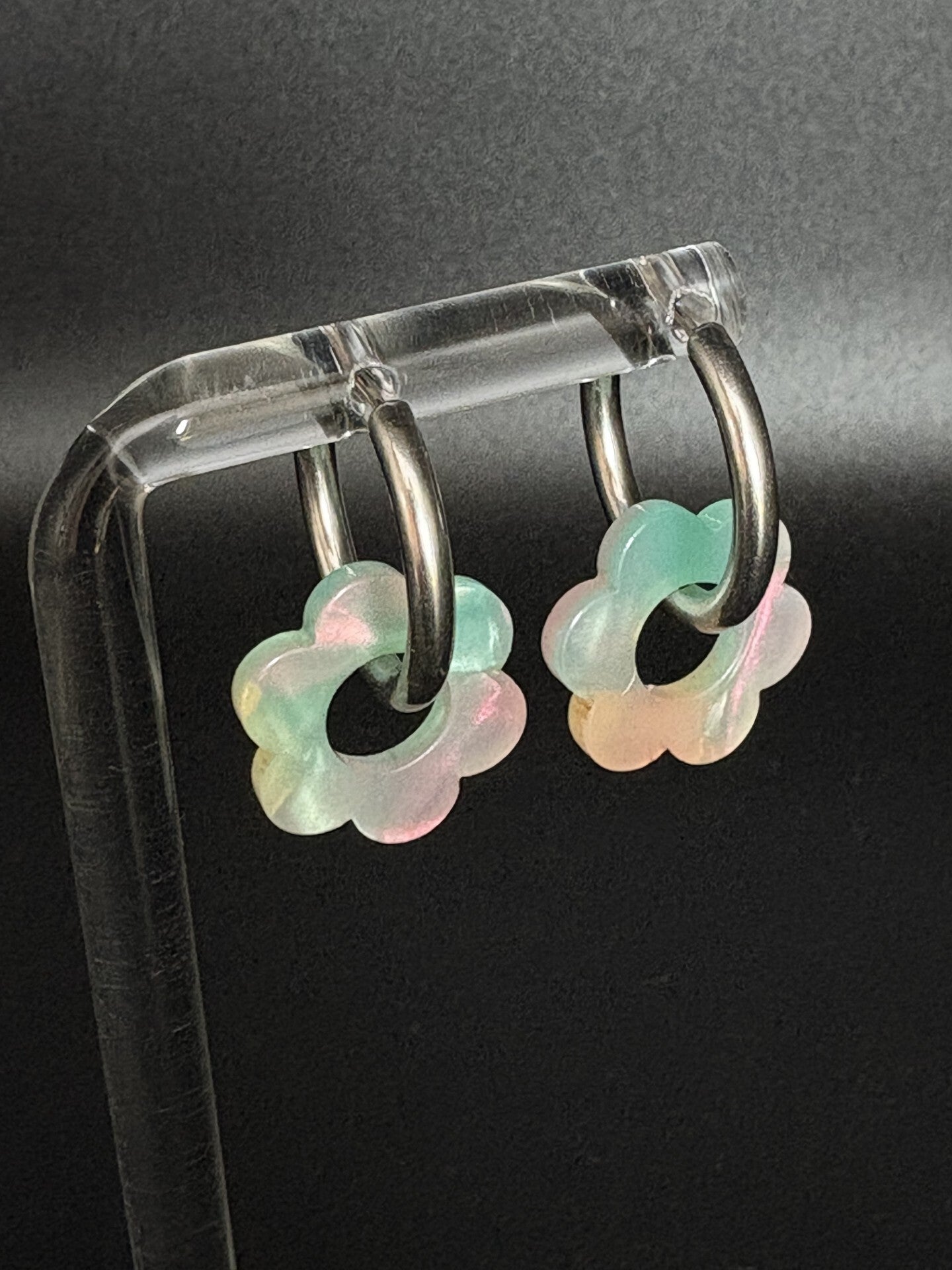 Ces boucles d'oreilles argentées fleur couleur rose et vert vous sublimera